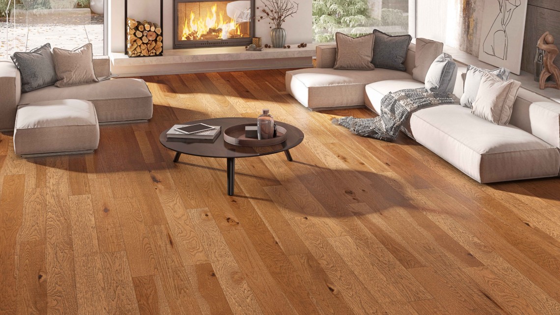 A modern twist on traditional hand scraped hardwood floors, made in Canada from premium oak hardwood. "Sculpting" the wood adds depth and detail to the wood. This texture helps hide everyday scratches and dents.