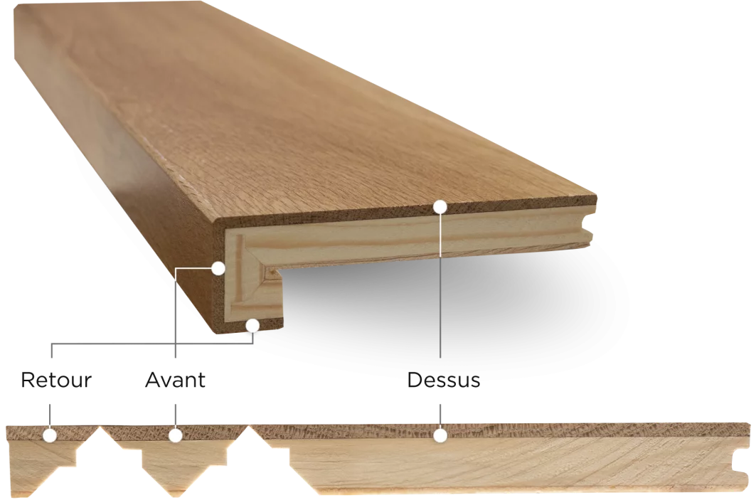Chaque marche d’escalier en bois franc requiert trois éléments essentiels : une marche pour la surface du pas, un nez de marche pour le bord et une contremarche pour la face verticale.