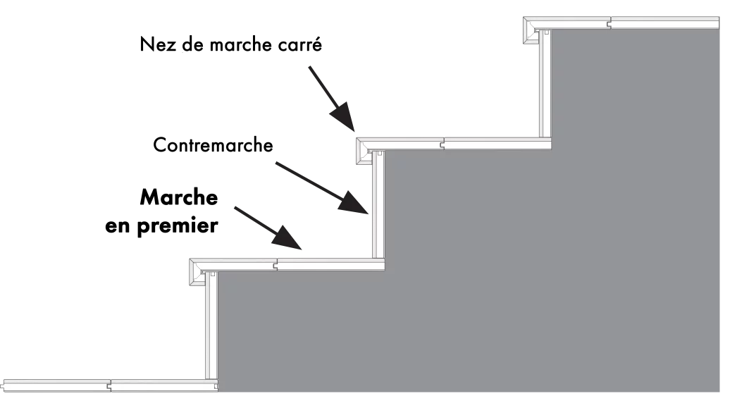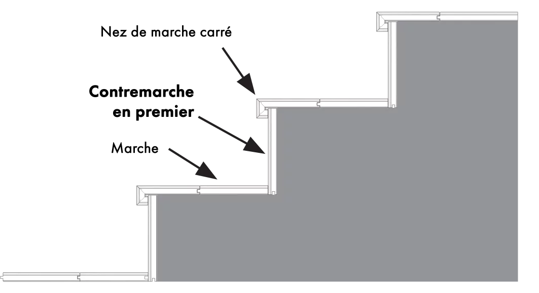 La marche est posée en premier, suivie du nez de marche et de la contremarche. Cette approche facilite un alignement précis du nez de marche et de la contremarche par rapport à la marche, pour un look uniforme.